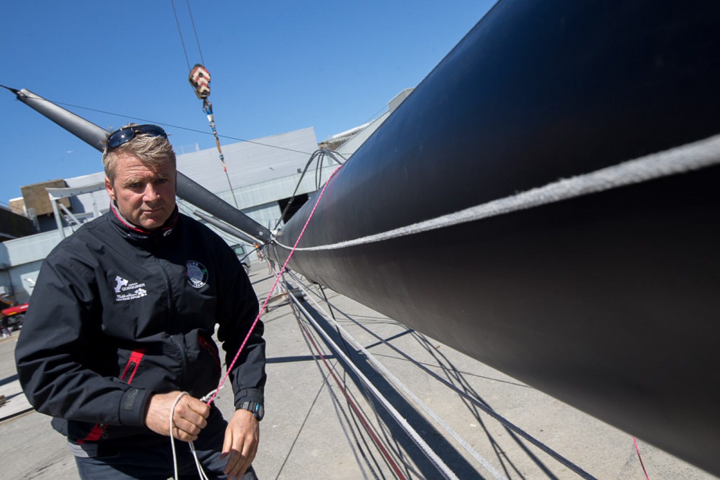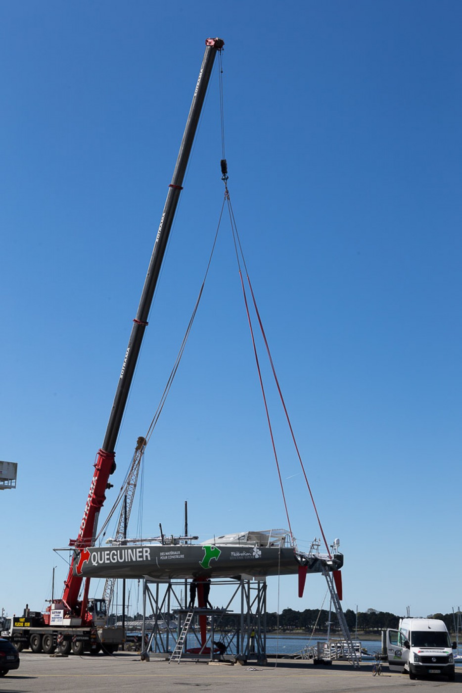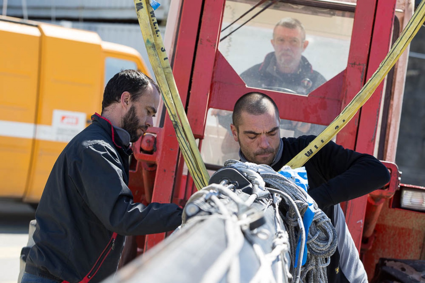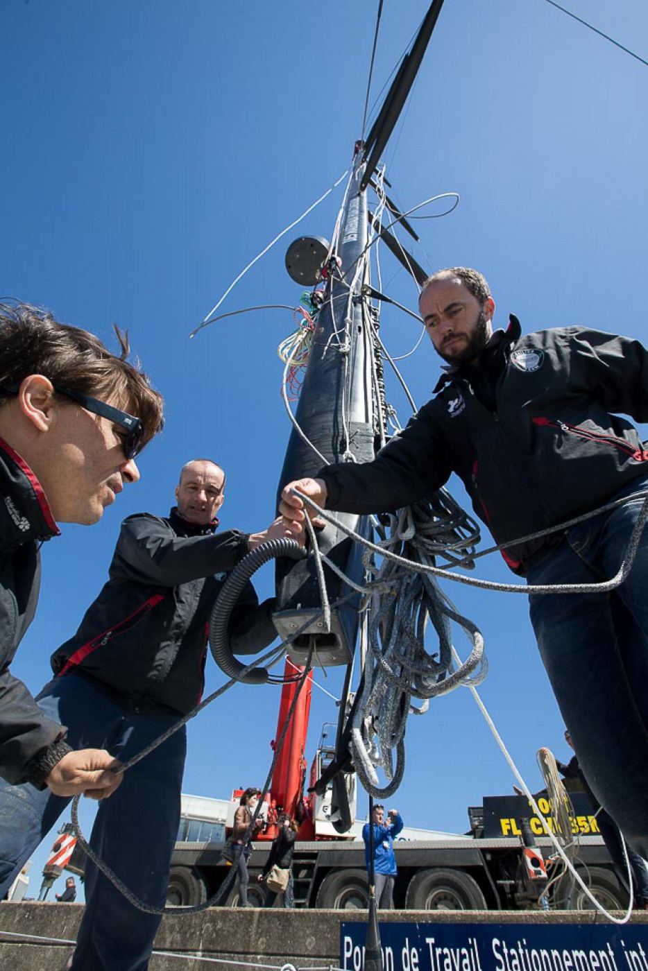 « Comme prévu, nous avons sorti « la bête » du chantier à 7h30. Elle a ensuite été quillée sur le terre-plein aux alentours de 9h30 avant d’être mise à l’eau à 13h30. Nous l’avons mâtée dans la foulée. Tout s’est bien passé. Nous avons même été plutôt vernis puisque nous avons profité d’un grand soleil pendant chaque phase de l’opération. Nous avons également procédé au test de jauge à 90° en fin de journée. Initialement, nous avions programmé de l’effectuer demain mais il y a du vent fort d’annoncé, c’est pourquoi nous avons préférer l’avancer. »