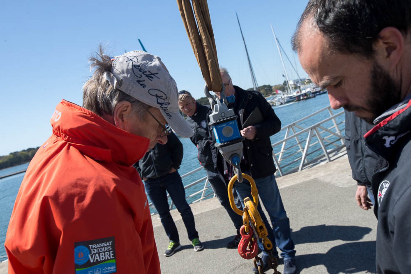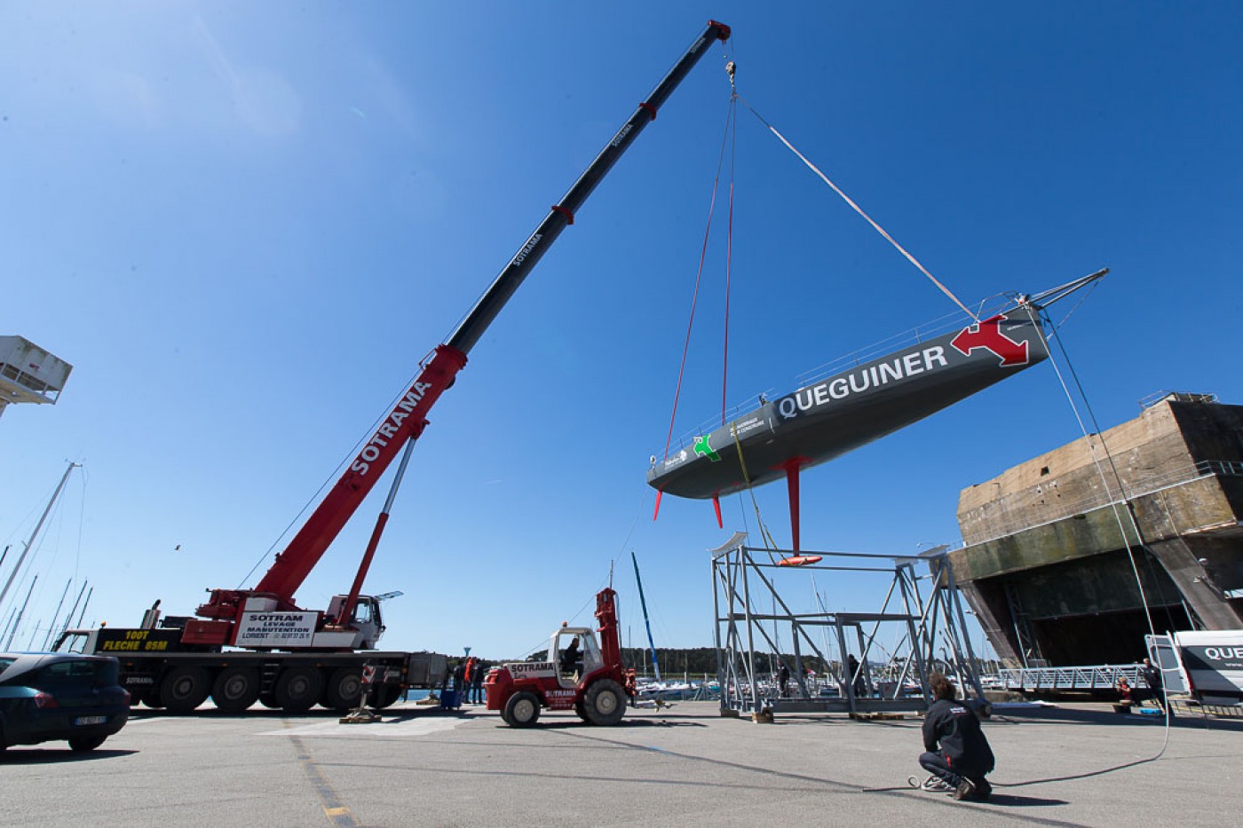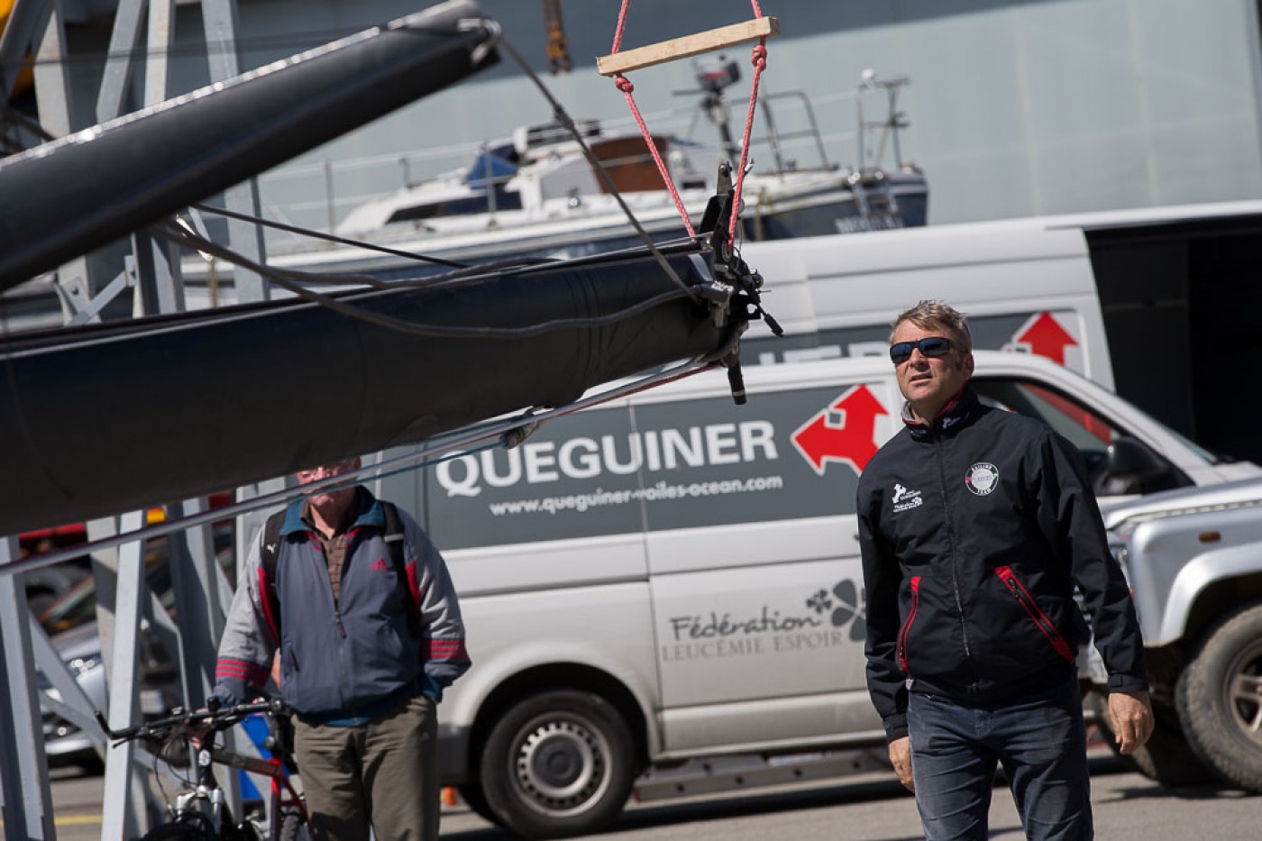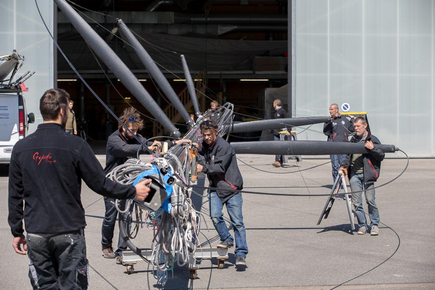 « Comme prévu, nous avons sorti « la bête » du chantier à 7h30. Elle a ensuite été quillée sur le terre-plein aux alentours de 9h30 avant d’être mise à l’eau à 13h30. Nous l’avons mâtée dans la foulée. Tout s’est bien passé. Nous avons même été plutôt vernis puisque nous avons profité d’un grand soleil pendant chaque phase de l’opération. Nous avons également procédé au test de jauge à 90° en fin de journée. Initialement, nous avions programmé de l’effectuer demain mais il y a du vent fort d’annoncé, c’est pourquoi nous avons préférer l’avancer. »