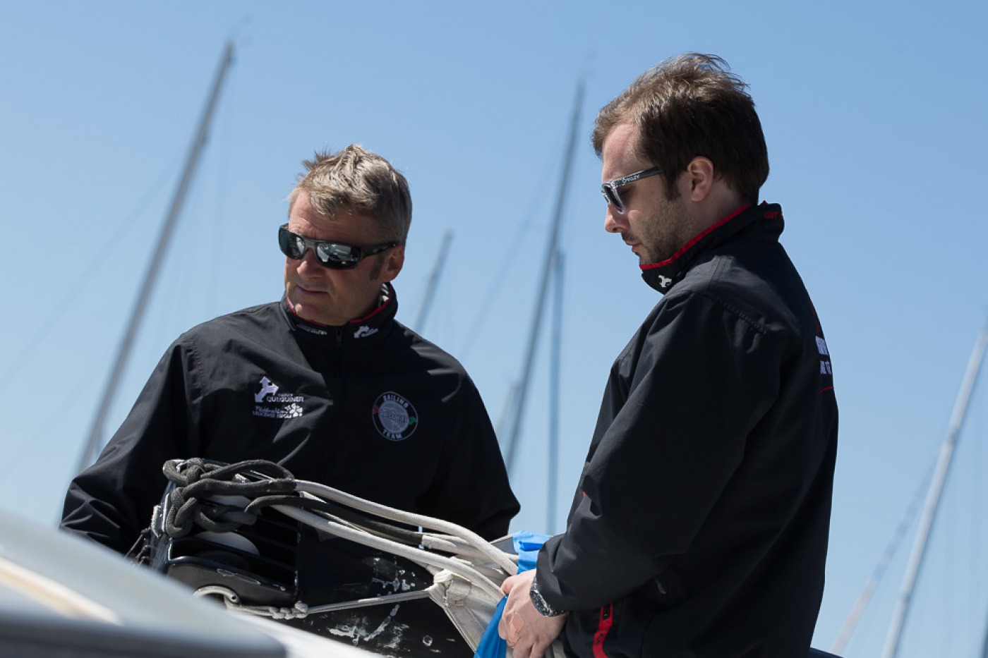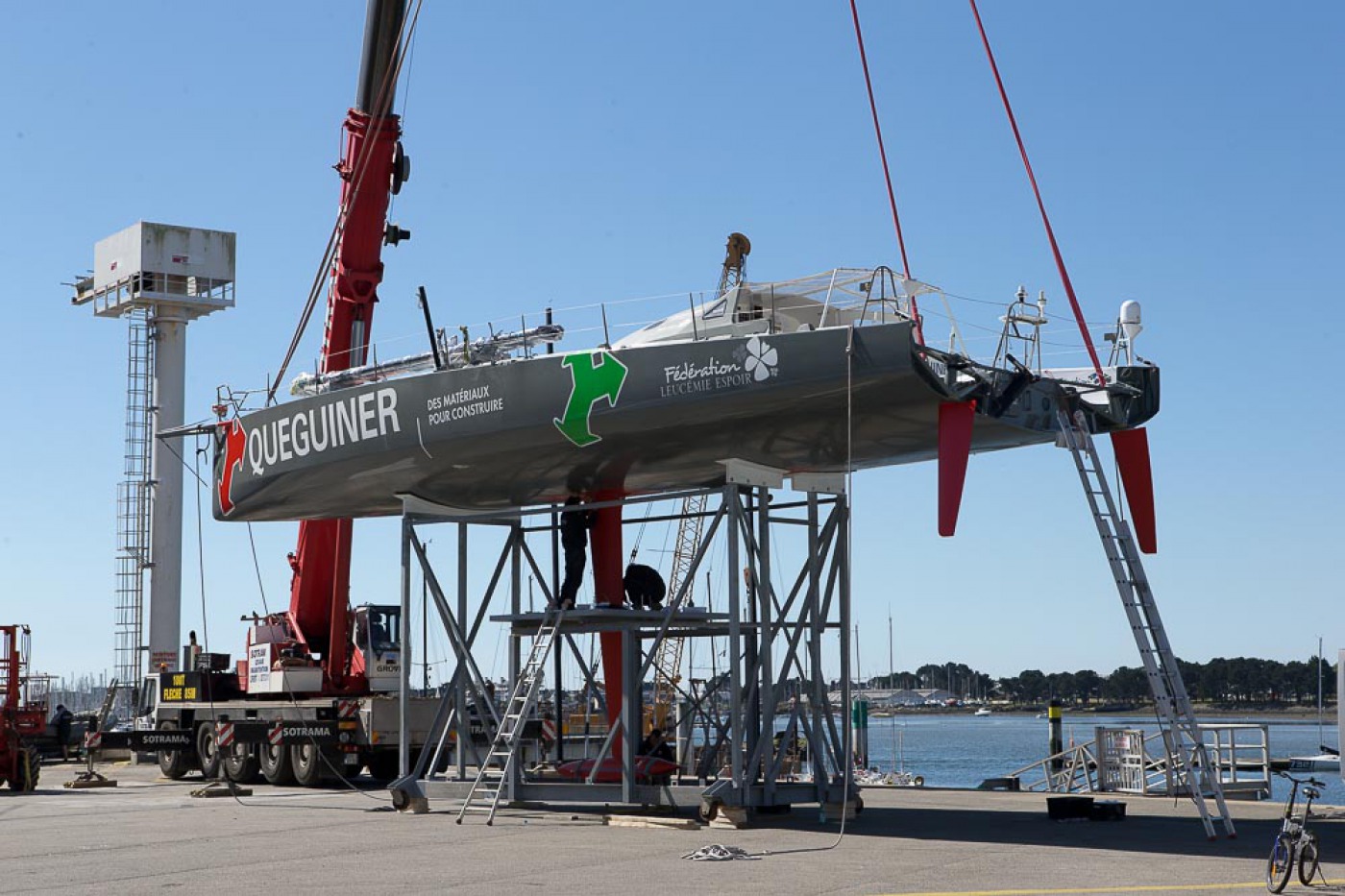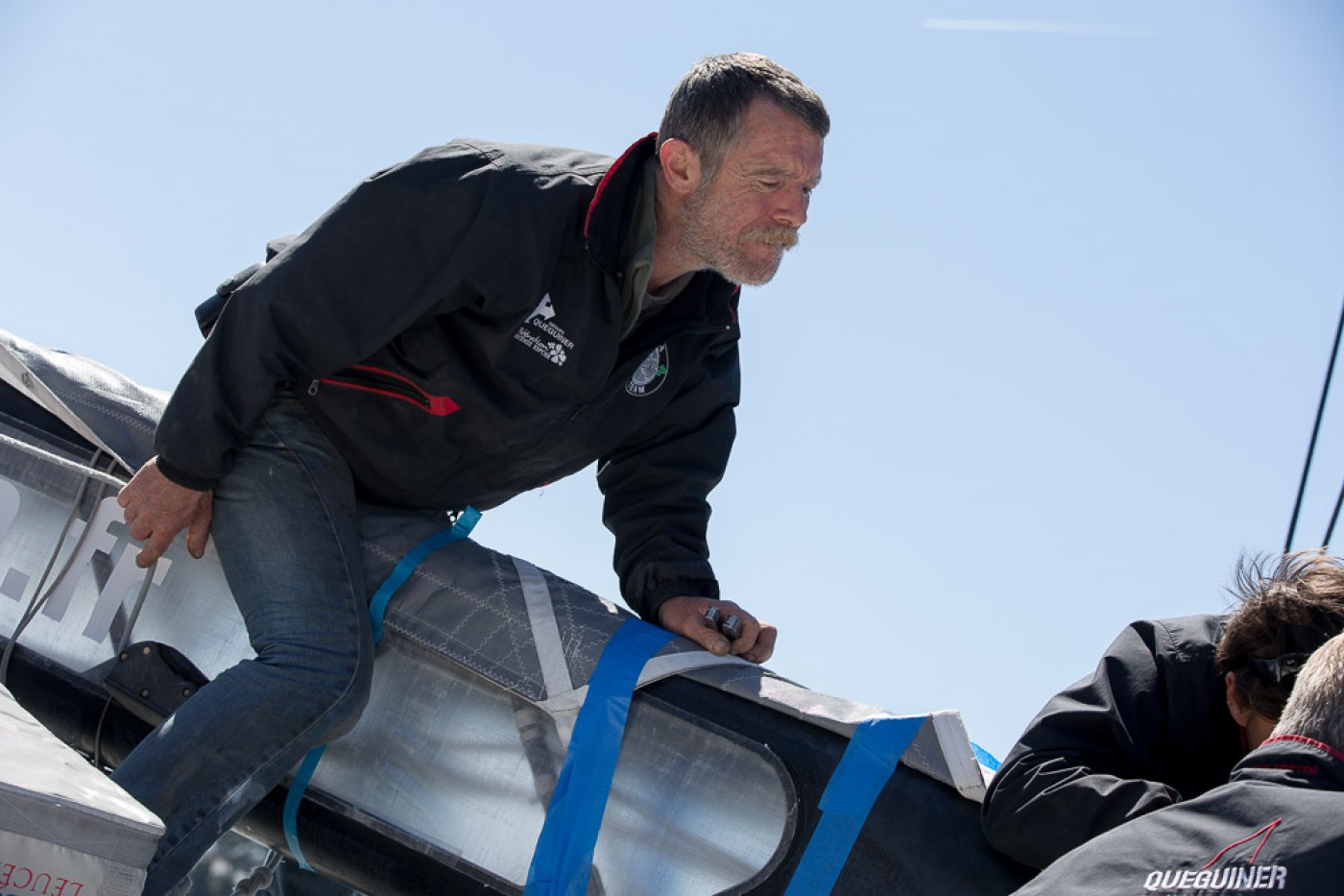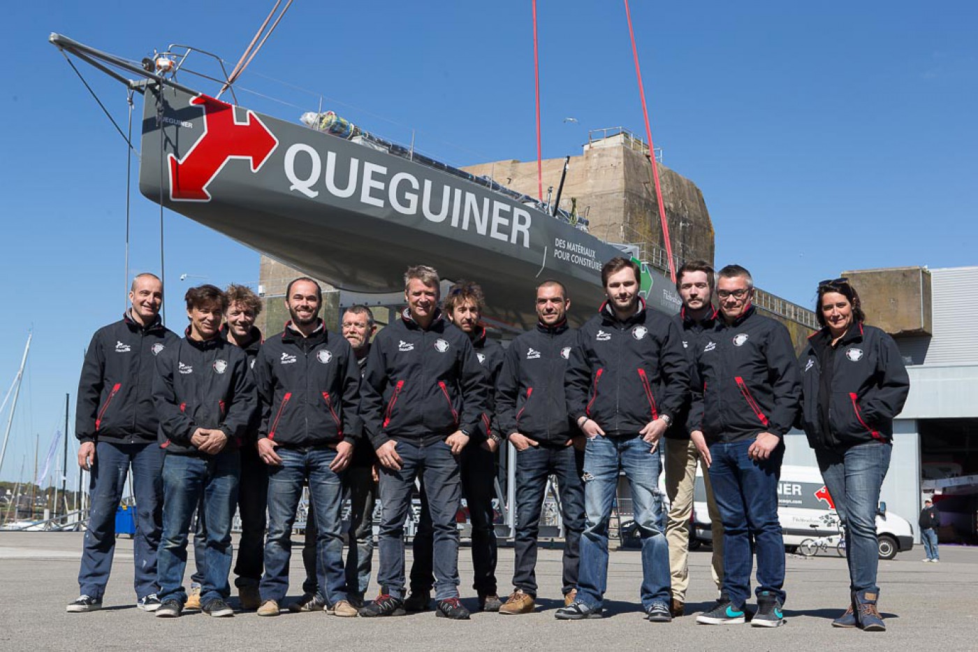 « Comme prévu, nous avons sorti « la bête » du chantier à 7h30. Elle a ensuite été quillée sur le terre-plein aux alentours de 9h30 avant d’être mise à l’eau à 13h30. Nous l’avons mâtée dans la foulée. Tout s’est bien passé. Nous avons même été plutôt vernis puisque nous avons profité d’un grand soleil pendant chaque phase de l’opération. Nous avons également procédé au test de jauge à 90° en fin de journée. Initialement, nous avions programmé de l’effectuer demain mais il y a du vent fort d’annoncé, c’est pourquoi nous avons préférer l’avancer. »