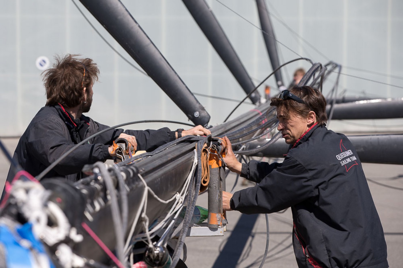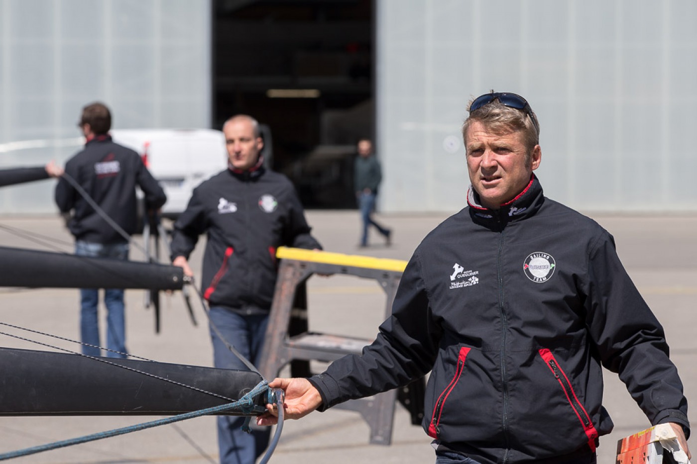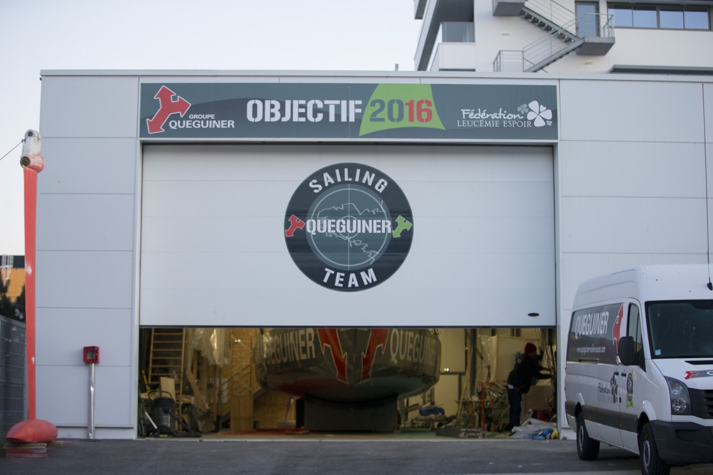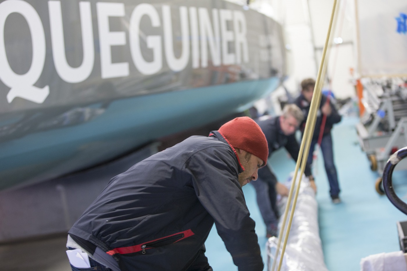 « Comme prévu, nous avons sorti « la bête » du chantier à 7h30. Elle a ensuite été quillée sur le terre-plein aux alentours de 9h30 avant d’être mise à l’eau à 13h30. Nous l’avons mâtée dans la foulée. Tout s’est bien passé. Nous avons même été plutôt vernis puisque nous avons profité d’un grand soleil pendant chaque phase de l’opération. Nous avons également procédé au test de jauge à 90° en fin de journée. Initialement, nous avions programmé de l’effectuer demain mais il y a du vent fort d’annoncé, c’est pourquoi nous avons préférer l’avancer. »