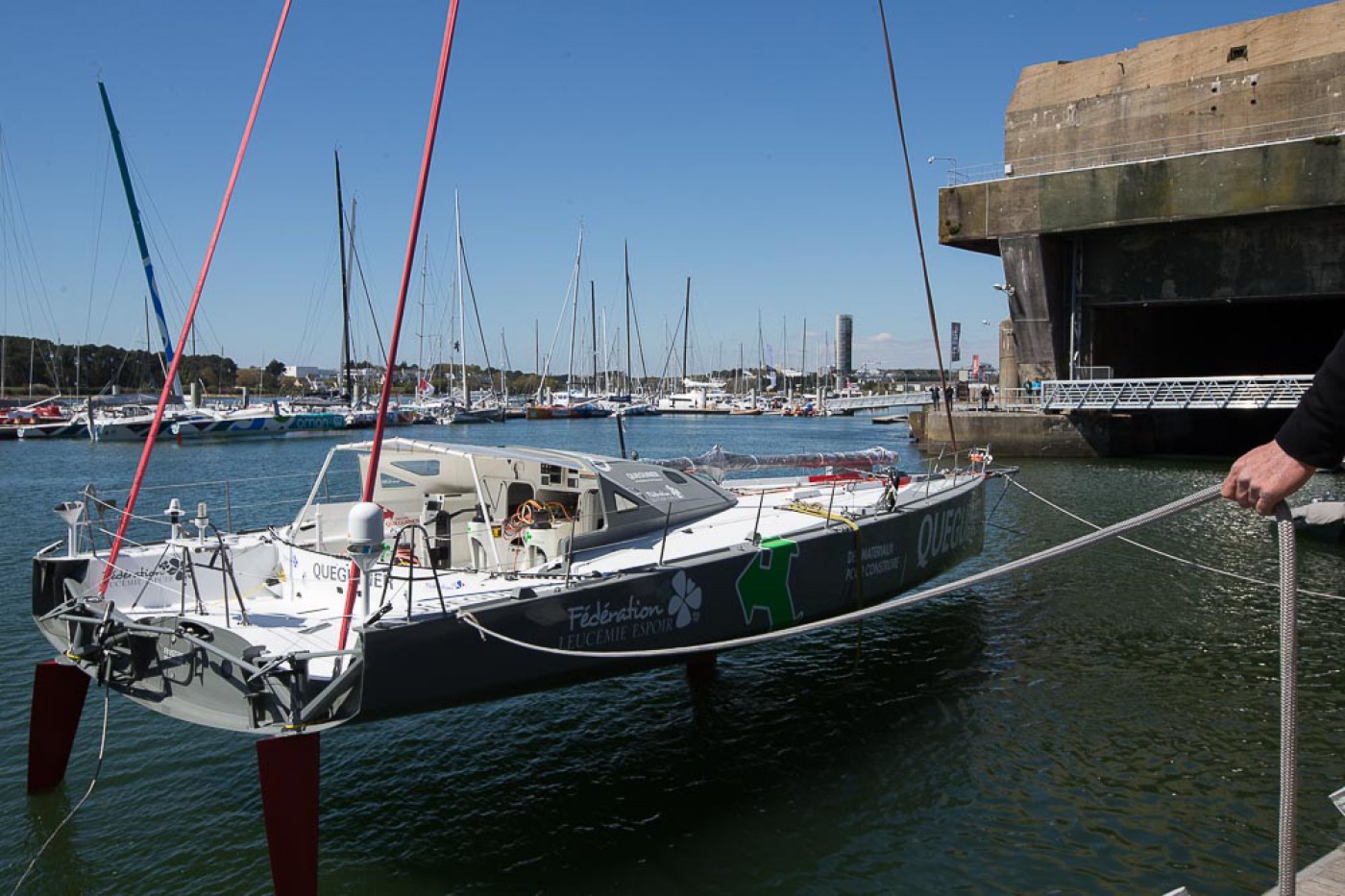 Après trois mois et demi de chantier, le 60 pieds Quéguiner – Leucémie Espoir a retrouvé son élément, ce lundi, à Lorient. Pour Yann et toute son équipe, c’est forcément un moment fort en émotions et une étape importante dans leur projet, tout comme le seront également les premières navigations, prévues ce jeudi. Il s’agira alors de tester et valider les modifications apportées sur le bateau, à savoir le système de safran et le passage à la nouvelle jauge. En attendant, le skipper peut être fier du travail de son équipe qui n’a pas ménagé ses efforts pour relever le défi de tout boucler dans le temps imparti. D’ailleurs, il le dit haut et fort. Interview.