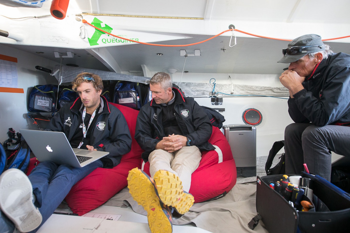 « Dimanche, nous devrions partir avec entre 10 et 15 nœuds de vent. Au final, ce devrait dont être un départ assez cool, si même cela va forcément favoriser la venue de beaucoup de bateaux spectateurs sur l’eau qu’il faudra faire attention d’éviter. Après une heure ou deux, ça devrait monter progressivement pour atteindre une trentaine de nœuds dans certains passages de grains. Il y aura de l’instabilité mais nous devrions avaler le golfe de Gascogne au vent de travers, à 90° du vent. Pour l’heure, nous nous orientons vers un passage à l’intérieur du DST (Dispositif de Séparation de Trafic). Après le passage du cap Finisterre, nous devrions choquer les écoutes et attaquer un bord de portant encore un peu incertain. De fait, aujourd’hui, les modèles ne sont pas d’accord entre eux. Certains nous font aller chercher la courbure anticyclonique qui se trouve un peu dans l’ouest, nous décalant ainsi favorablement pour l’approche du Pot-au-Noir. Un autre restreint notre route à l’intérieur d’un petit couloir de vent le long du Portugal et des côtes africaines, ce qui nous obligerait alors à tirer des bords de vent arrière avant de trouver le moment opportun pour nous recaler dans l’ouest assez tardivement, une fois le Cap Vert passé. Ce sont deux scénarii relativement cléments. Stratégiquement, évidemment qu’il y aura des pièges (le cap Finisterre, le dévent des îles…) mais il n’y aura, a priori, pas de raison de casser. En clair, il n’y a pas de raison de craindre les premières heures de course. »