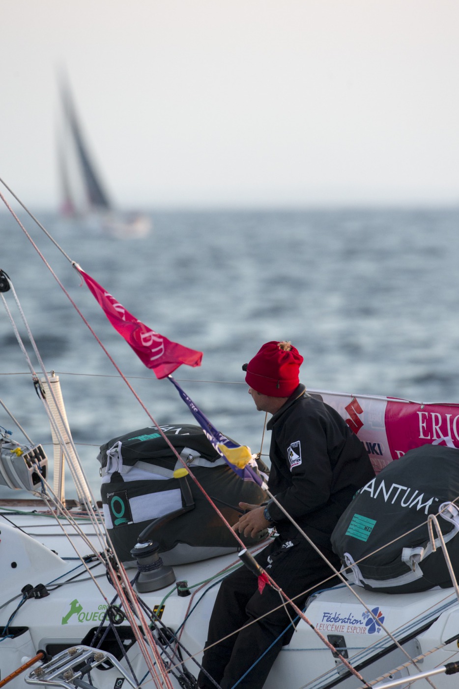 «Nous sommes tellement proches, que nous sommes à portée de voix» s’amusait le briochin à la vacation ce midi. A défaut de se semer, les deux compères semblent avoir fait le break sur le reste de la meute, même si un petit groupe emmené par Xavier Macaire reste potentiellement dangereux comme le soulignait Yann tout à l’heure « Ils ne sont pas mauvais les garçons. Pour l’instant, on arrive à les tenir en respect à 1,5 mille, mais je ne sais pas si ça va durer ! soulignait Yann, qui bien qu’ayant retrouvé un peu de vitesse, se méfiait de cette dorsale dont il n’était pas encore certain d’être libéré : «On est repassé en bâbord amure, avec un vent de Sud, Sud- Ouest. Normalement nous sommes de l’autre côté, ce qui signifie qu’on est tiré d’affaire, mais il ne faudrait pas qu’elle s’amuse à monter et descendre, car si elle fait le yoyo, ce sera plus compliqué, mais j’ai bon espoir que ce soit fait » expliquait le briochin, qui dans la foulée, ne cachait pas son désir de saluer en tête le phare de Wolf Rock. Un endroit lourd de souvenir. C’est au large de ce rocher que Yann avait démâté l’année dernière, voyant s’envoler toutes ses chances de s’offrir un triplé. «J'espère bien passer à Wolf Rock en tête pour conjurer le sort. Ce serait une belle histoire.» confiait-t-il.