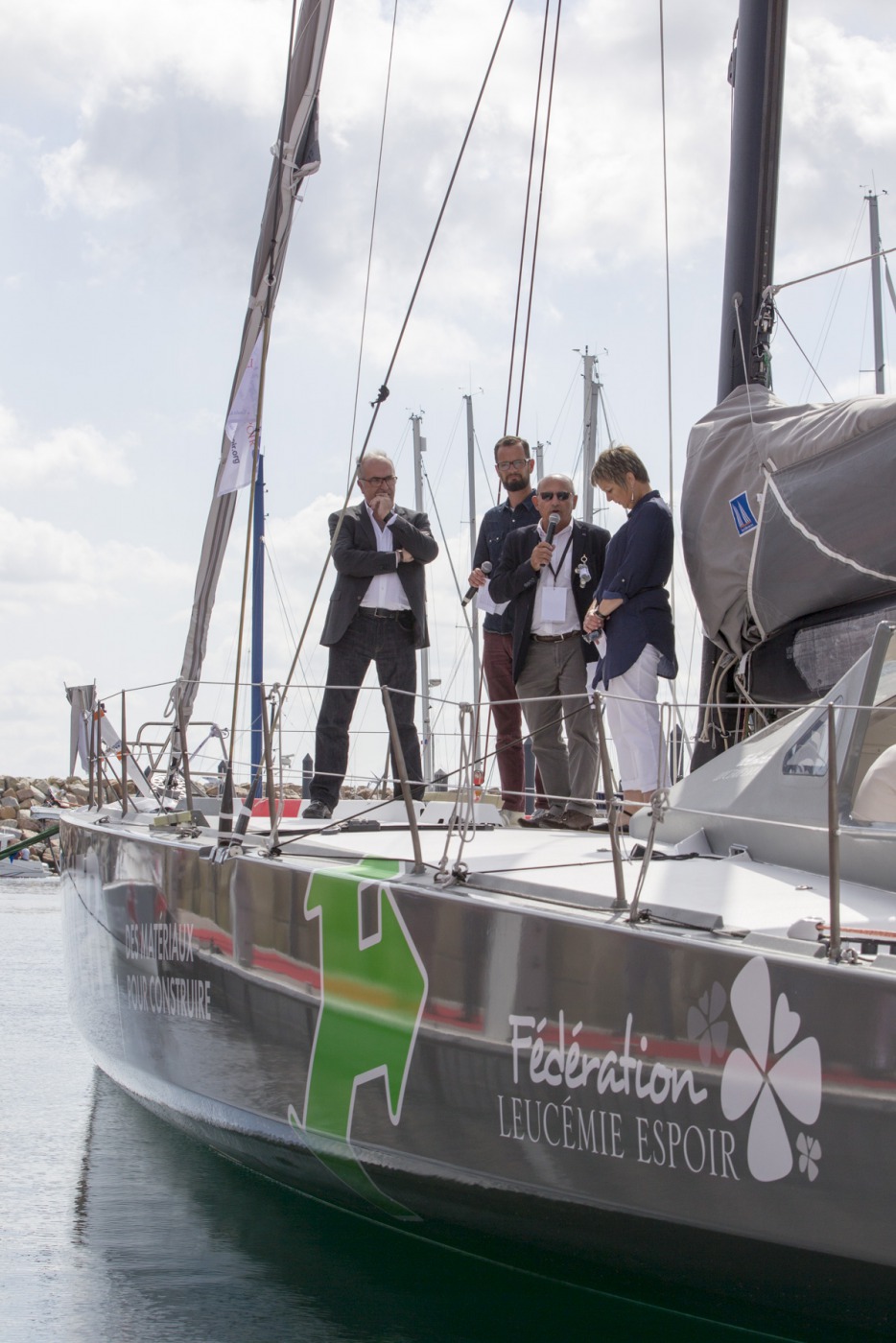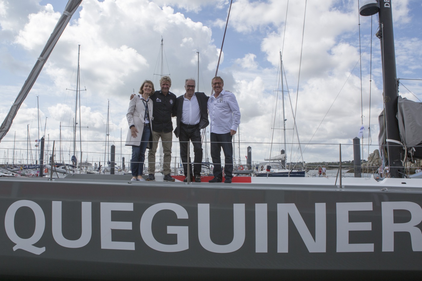 Sorti de chantier le 23 juin dernier, pour la mise à l’eau à Lorient, c’est au Nord de la Bretagne, que le 60 pieds de Yann Eliès a été baptisé ce matin. En effet, c’est au cœur du Bloscon, le nouveau port de Roscoff, que cette grande cérémonie a eu lieu. Situé à quelques encablures de Landivisiau, où l’entreprise Quéguiner a été fondée en 1967, Roscoff était le lieu idéal pour réunir la grande famille des salariés autour d’un grand moment de convivialité, comme le souhaitait Claude Quéguiner, le président du Groupe. Très attaché aux valeurs familiales, ce dernier n’a pas hésité à convier les enfants et les conjoints de ses collaborateurs. «C’était un joli moment. L’émotion n’a cessé de grandir depuis la sortie du bateau il y a dix jours à Lorient, et je suis très heureux de ce partage avec les salariés du groupe, mais aussi avec les bénévoles de la Fédération Leucémie Espoir, les passionnés de voile, et les roscovites venus participer à l’événement. J’ai une pensée pour mon père et ma mère qui ont crée cette entreprise, et qui doivent apprécier le spectacle. Vu du ciel ce doit être encore plus beau » confiait Claude Quéguiner, à l’issue de la cérémonie. Très ému également, André Civray, l’ancien président de la Fédération Leucémie Espoir, a profité de cette belle manifestation pour passer le relai de la présidence à Françoise Tillier, après plus de 30 ans passés à la tête de cette association.