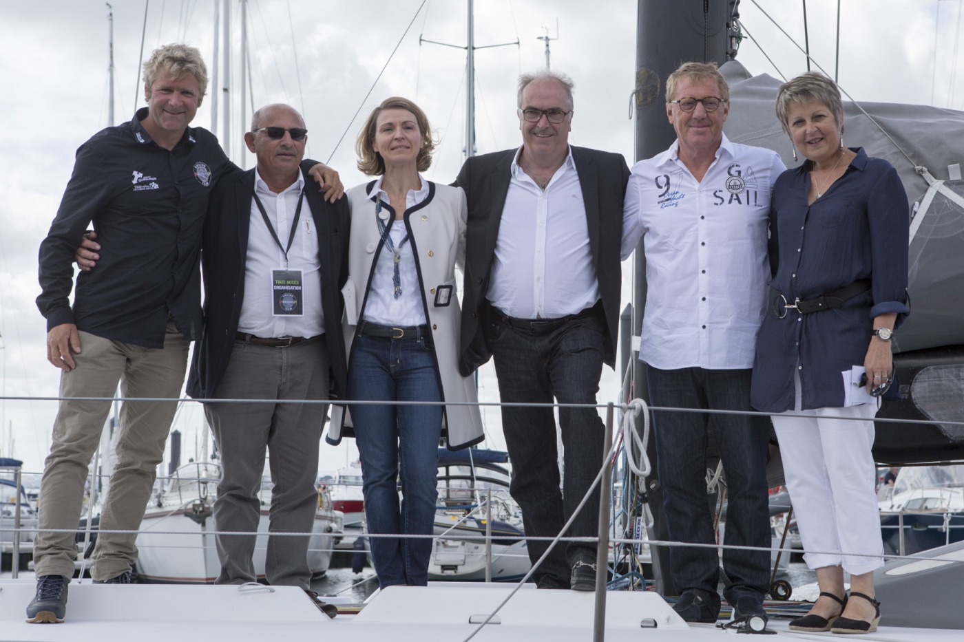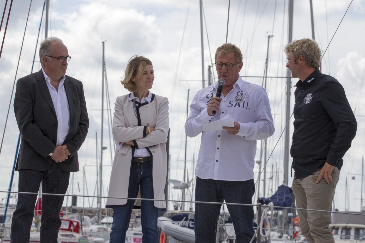 Alex Dupont, c’est le parrain du projet, qui a eu la lourde responsabilité de briser cette bouteille comme il se doit. Au delà d’être l’entraîneur de foot du Stade Brestois, ce passionné est un ami de longue date de la famille Quéguiner, qui soutient le club depuis quinze ans. Un homme que Yann apprécie énormément lui aussi «Alex fait un travail incroyable au Stade Brestois, et c’est un ami avec qui, le courant est passé tout de suite. Je partage les valeurs qu’il inculque à ses joueurs, des valeurs de travail, de courage et de dépassement de soi. C’est un homme qui aime la simplicité et qui est assez accessible comme Claude. C’est un vrai bonheur d’échanger avec lui et de le voir à nos côtés aujourd’hui.» confiait Yann à propos du parrain de Groupe Quéguiner - Leucémie Espoir. Quant à la marraine, c’est Catherine, la femme de Claude Quéguiner qui a été choisie. Une façon de la remercier comme le confiait ce dernier. «C’est une forme de reconnaissance pour tout son travail et son soutien depuis tant d’années. Je me suis souvent reposé sur elle pour prendre des décisions, et celle de se lancer dans l’aventure du Vendée Globe n’était pas facile à prendre. Elle m’a encouragé, et je suis très heureux de l’associer au projet, elle qui a de belles valeurs familiales, tout comme Yann. C’est ce qui nous lie.»