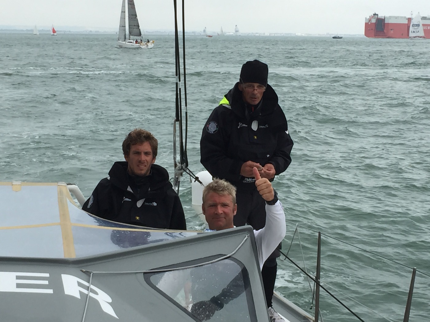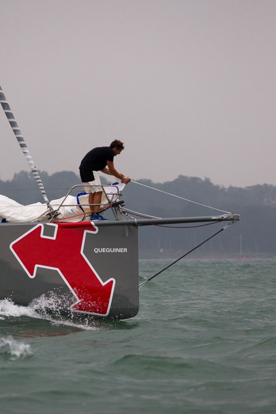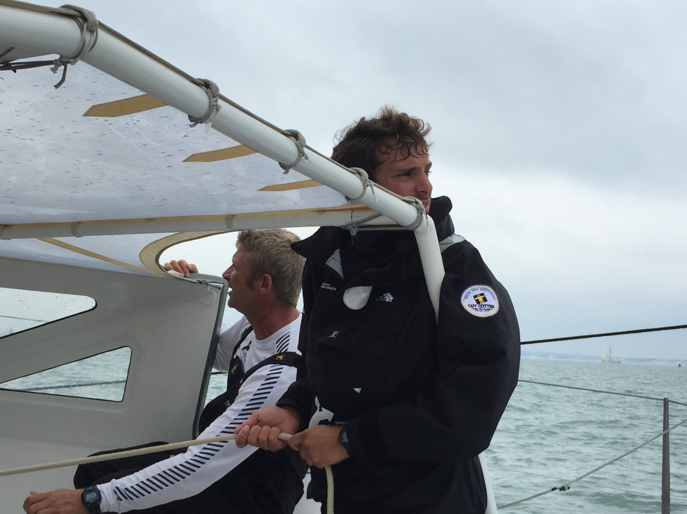 C’est sous une pluie battante et dans une véritable purée de pois, que les concurrents engagés sur la neuvième édition de l’Artemis Challenge se sont élancés ce matin, pour une course de 50 milles autour de l’Ile de Wight. Accompagné de Charlie Dalin, avec qui, il prendra le départ de Transat Jacques Vabre le 25 octobre prochain, de son coach Daniel Souben, et de plusieurs membres de son équipe technique, Yann Eliès s’est offert une belle deuxième place, dans des conditions, qui à défaut d’être agréables, ont permis de belles bagarres.«On s’est fait rincer toute la journée, et on n’a rien vu ! C’est dommage, car on a longé la partie Sud de l’ile qui est très jolie. Mais de toute façon, on n’aurait pas eu le temps d’admirer le paysage» confiait Yann avant d’ajouter. «Il y a eu plusieurs passages un peu chauds, et notamment une partie de rase cailloux avec ces bateaux qui ont tout de même 4,50m de tirant d’eau, c’est un jeu dangereux, mais on s’en est bien sorti» confiait le briochin. Même son de cloche chez Charlie, qui lui, découvre la compétition sur ces machines de 18 mètres de long. «On a eu un bon temps à l’anglaise, avec très peu de visibilité, mais cette course était géniale. Ce sont des bateaux fabuleux, qui sont très exigeants physiquement, mais qui offrent beaucoup de plaisir. Faire un tour de l’Ile de Wight en cinq heures, peu de monocoques peuvent le faire !» se réjouissait-il résolument séduit par ce support.
