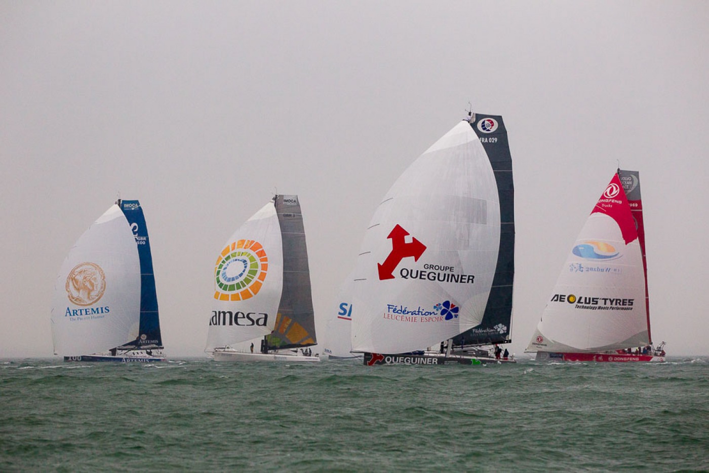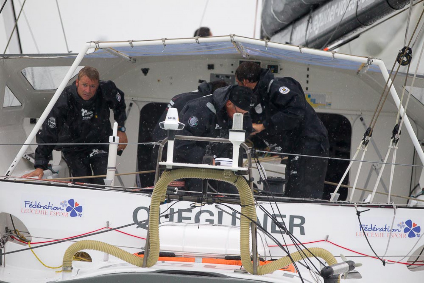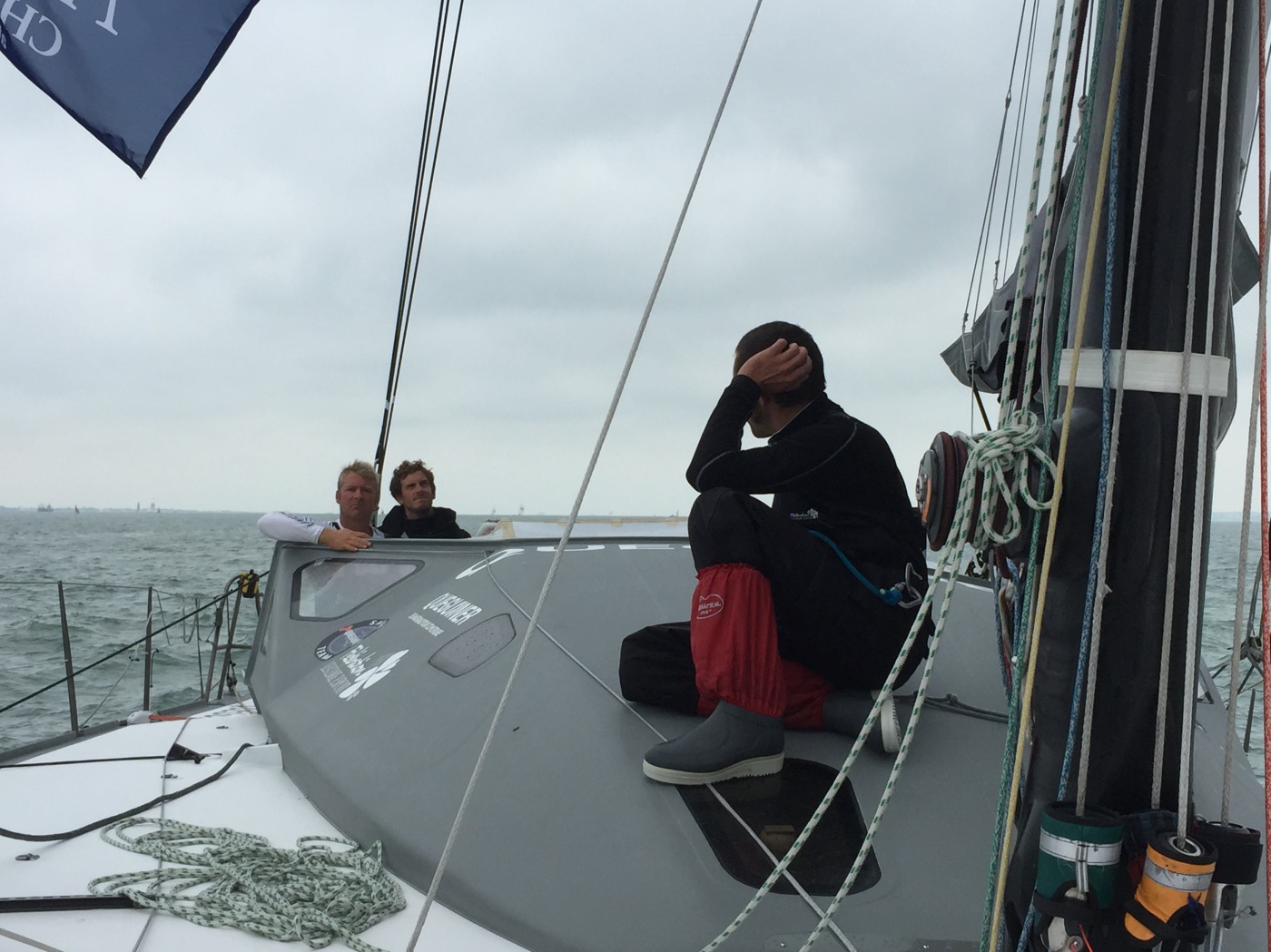 C’est sous une pluie battante et dans une véritable purée de pois, que les concurrents engagés sur la neuvième édition de l’Artemis Challenge se sont élancés ce matin, pour une course de 50 milles autour de l’Ile de Wight. Accompagné de Charlie Dalin, avec qui, il prendra le départ de Transat Jacques Vabre le 25 octobre prochain, de son coach Daniel Souben, et de plusieurs membres de son équipe technique, Yann Eliès s’est offert une belle deuxième place, dans des conditions, qui à défaut d’être agréables, ont permis de belles bagarres.«On s’est fait rincer toute la journée, et on n’a rien vu ! C’est dommage, car on a longé la partie Sud de l’ile qui est très jolie. Mais de toute façon, on n’aurait pas eu le temps d’admirer le paysage» confiait Yann avant d’ajouter. «Il y a eu plusieurs passages un peu chauds, et notamment une partie de rase cailloux avec ces bateaux qui ont tout de même 4,50m de tirant d’eau, c’est un jeu dangereux, mais on s’en est bien sorti» confiait le briochin. Même son de cloche chez Charlie, qui lui, découvre la compétition sur ces machines de 18 mètres de long. «On a eu un bon temps à l’anglaise, avec très peu de visibilité, mais cette course était géniale. Ce sont des bateaux fabuleux, qui sont très exigeants physiquement, mais qui offrent beaucoup de plaisir. Faire un tour de l’Ile de Wight en cinq heures, peu de monocoques peuvent le faire !» se réjouissait-il résolument séduit par ce support.