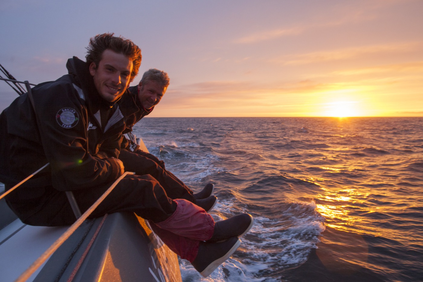 Au coude à coude avec PRB et SMA, le tandem a fait le choix de longer la côte des Cornouailles et de tricoter entre les cailloux, pour franchir la pointe Sud-Ouest de l’Angleterre. Spécialistes en la matière, comme ils l’ont montré cette année encore en Figaro, les deux marins ont brillamment tiré leur épingle du jeu, mais veulent garder la tête froide, conscients que la partie est loin d’être terminée. «Nous sommes bord à bord avec PRB et SMA et pour l’instant rien n’est fait. Nous nous tirons la bourre avec un groupe de cinq bateaux, c’est vraiment intéressant. Au lieu de passer près des Iles Scilly, nous avons fait le choix de nous décaler assez tôt vers la côte avec Banque Populaire, et ça nous a permis de toucher du thermique et un courant favorable un peu plus tôt, pour revenir au contact de PRB et SMA» confiait Charlie joint dans l’après-midi. Résolument dans le coup, le tandem aux commandes de Groupe Quéguiner - Leucémie Espoir peut se féliciter de rivaliser avec des bateaux plus performants sur le papier. Reste que la course est loin d’être terminée, et qu’il faudra tenir sur les 400 milles qu’il reste à parcourir. « Nous venons de décrocher de la côte pour mettre le cap sur l’extrémité Nord du DST Ouest (zone interdite à la navigation), et nous ne pouvons plus bénéficier du thermique qui nous a aidés à progresser ces dernières heures. Nous n’avons que trois noeuds de vent et ça risque de rester aussi mou un bon moment » avertissait Charlie, conscient que les jeux sont loin d’être faits.