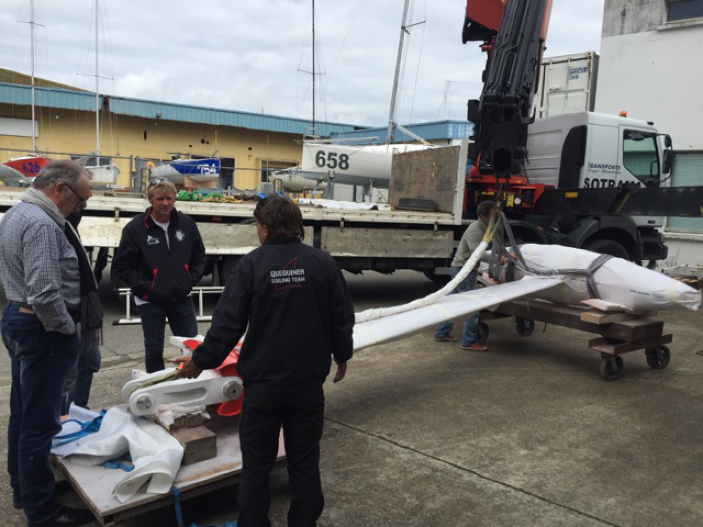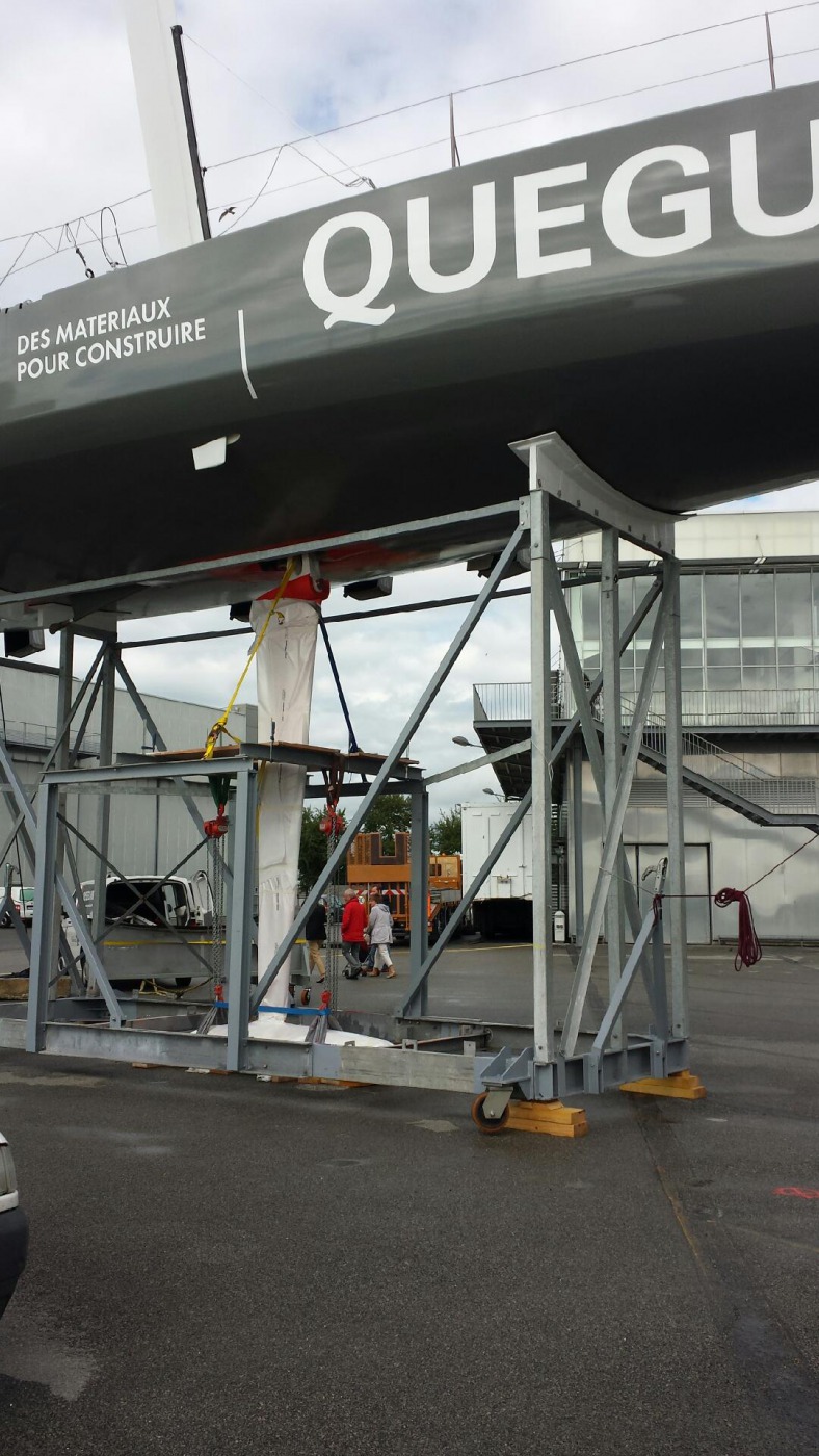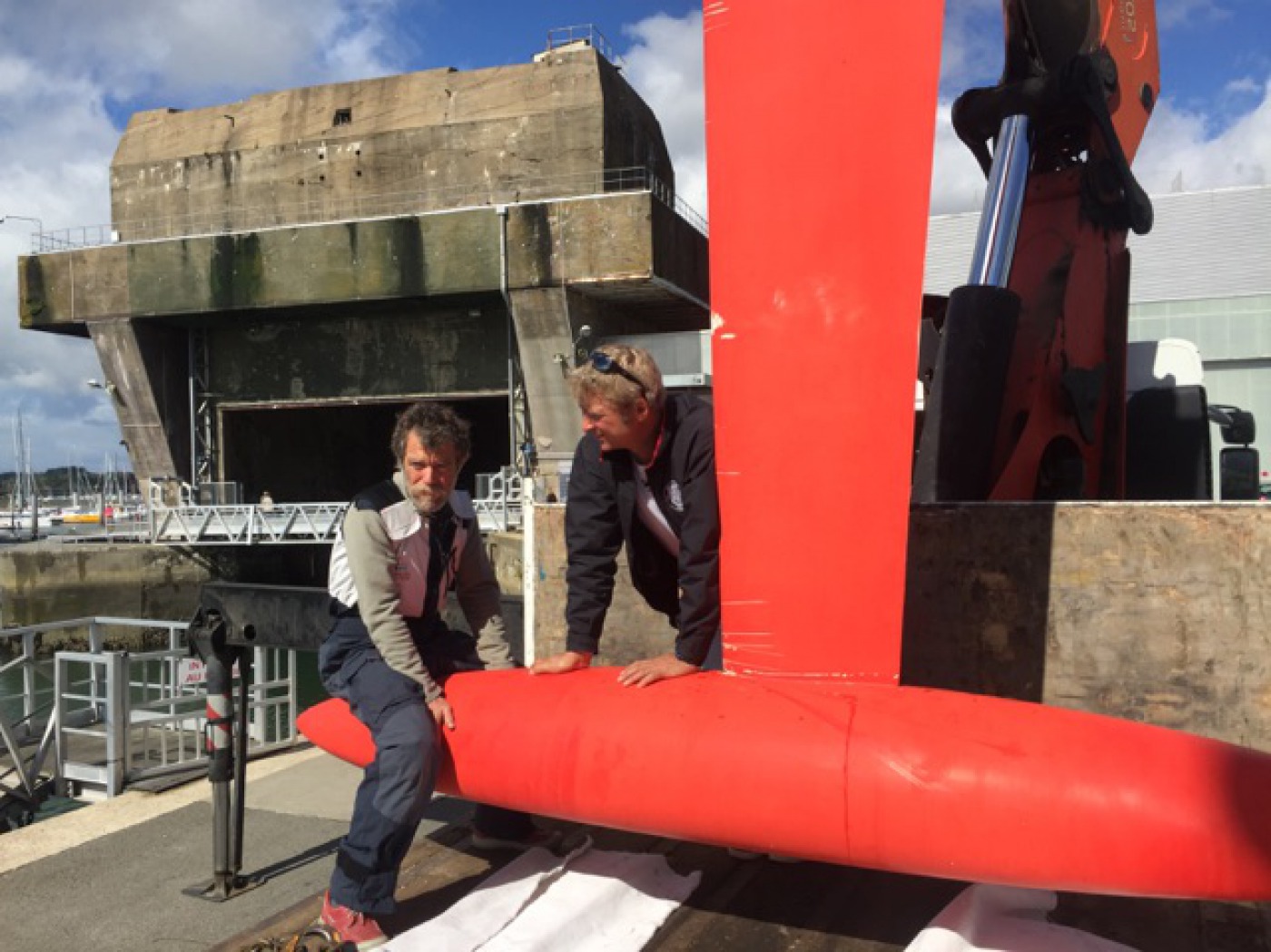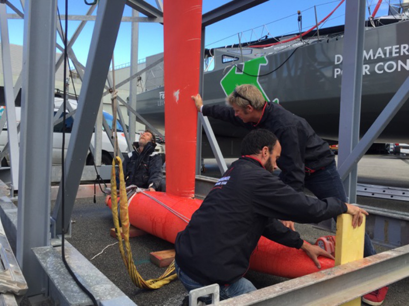 «Nous avons débuté très tôt pour laisser le temps à SᵗMichel-Virbac de faire son test à 180 degrés, et de passer à la jauge, car après il n’y a pas assez d’eau avec la marée. Quand on peut rendre service aux petits copains, c’est toujours sympa.» Premiers à entrer en piste, Yann et sa troupe auraient aimé boucler l’opération dans la journée, mais un imprévu a perturbé leurs plans : «Nous avons eu une petite surprise sur une pièce qui s’est oxydée beaucoup plus vite que prévu. Il a fallu en commander une nouvelle qui n’arrivera que demain. Nous sommes déçus car ça décale le timing d’une demie-journée, mais ça aurait pu entrainer une avarie sur la Transat Jacques Vabre, donc il vaut mieux que ça arrive maintenant. Il faut voir le bon côté des choses», relativise Yann. En stand-by, l’équipe devrait remettre le bateau à l’eau demain midi, puis des tests seront réalisés lundi. «Normalement, cette quille doit nous apporter plus de fiabilité, car elle est en inox, un matériau plus fiable que le carbone. Ce bateau a déjà perdu deux quilles, donc nous voulions assurer le coup, et nous en avons profité pour gagner aussi en matière de performance en reculant un peu le centre de gravité» confie le skipper de Quéguiner-Leucémie Espoir, qui testera ce nouvel appendice dès vendredi prochain à l’occasion du Trophée Azimut. Il participera ensuite à un dernier stage à Port-la-Forêt, avant le convoyage pour le Havre d’où s’élancera la Transat Jacques Vabre le 25 octobre prochain.