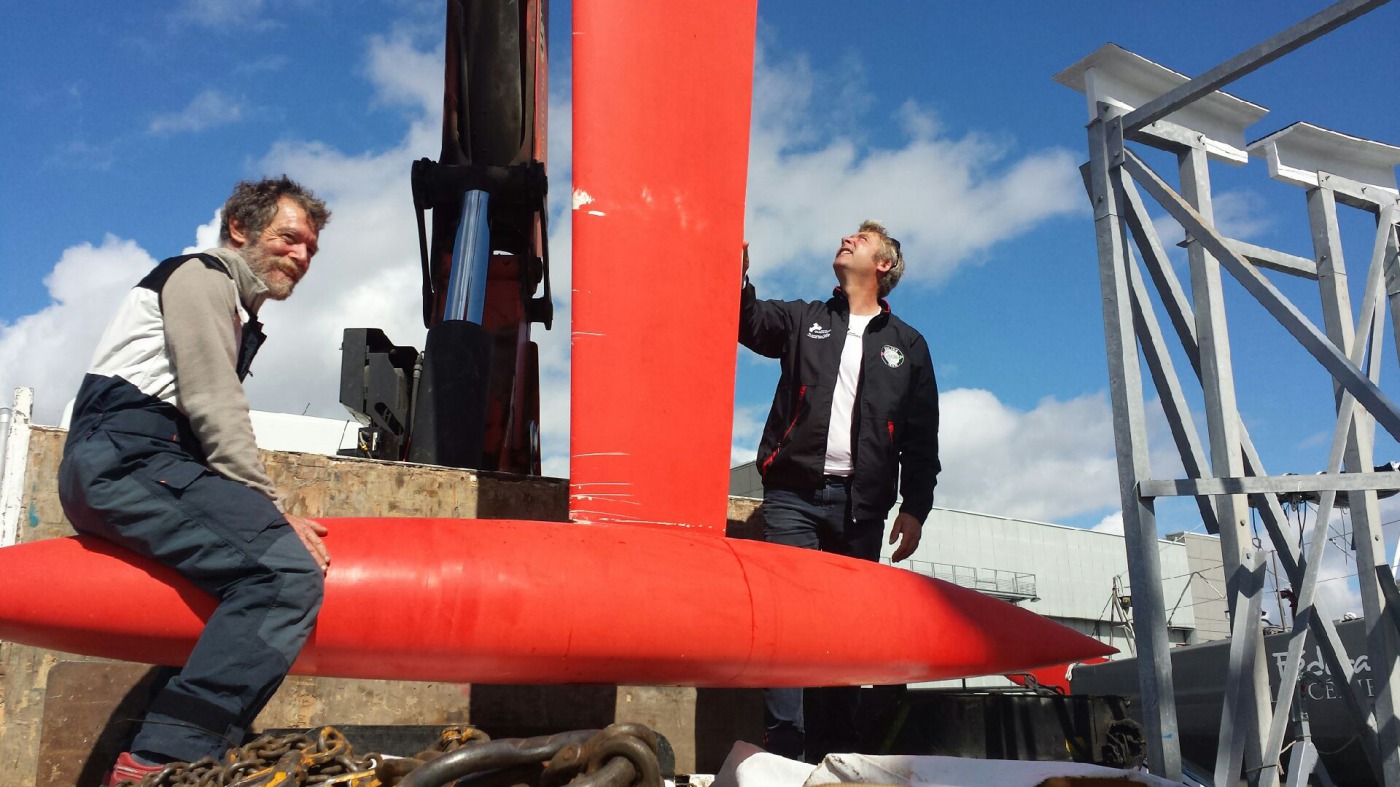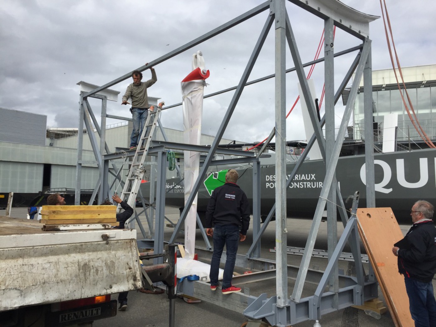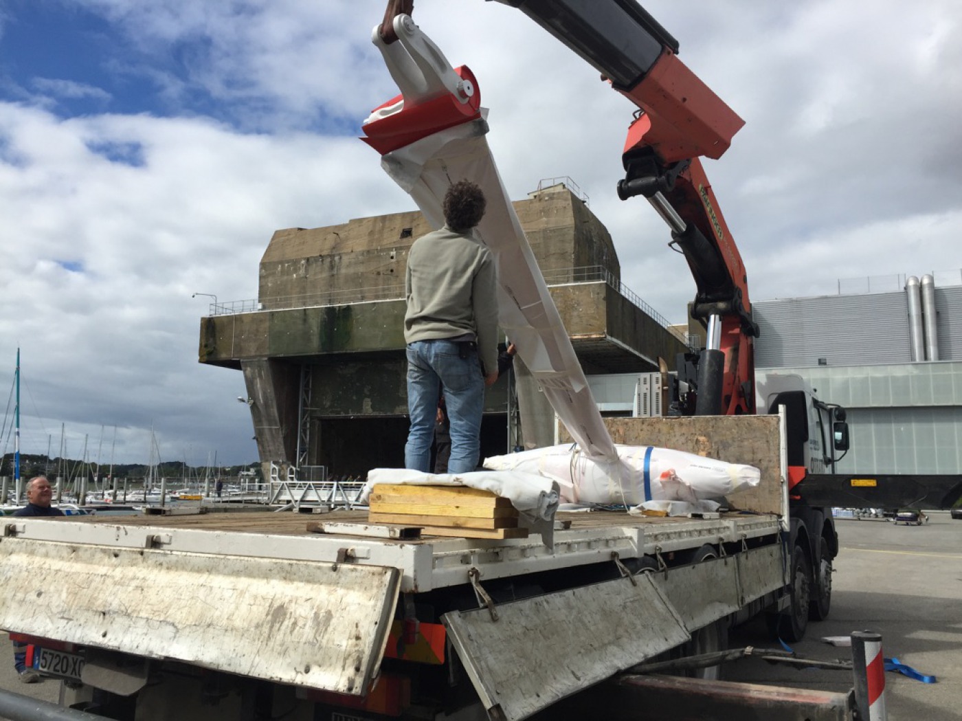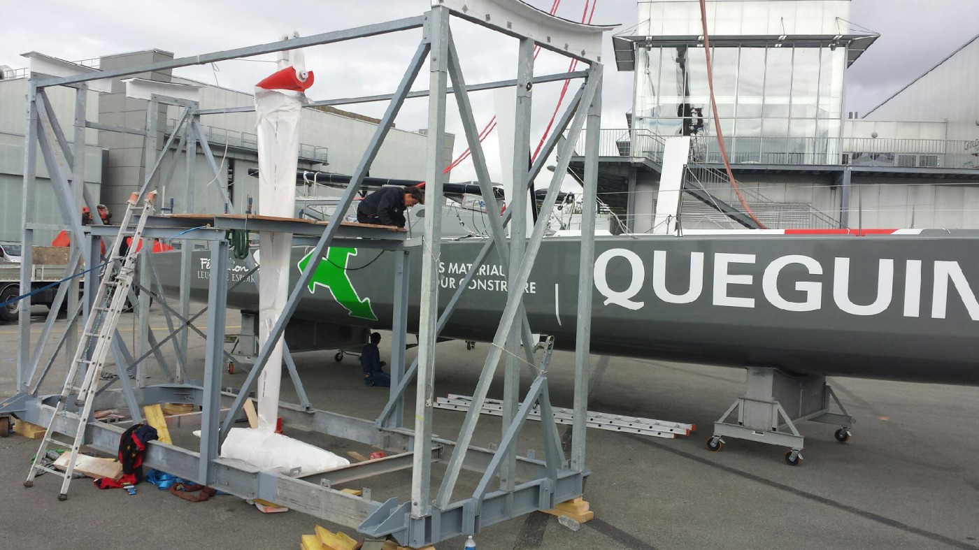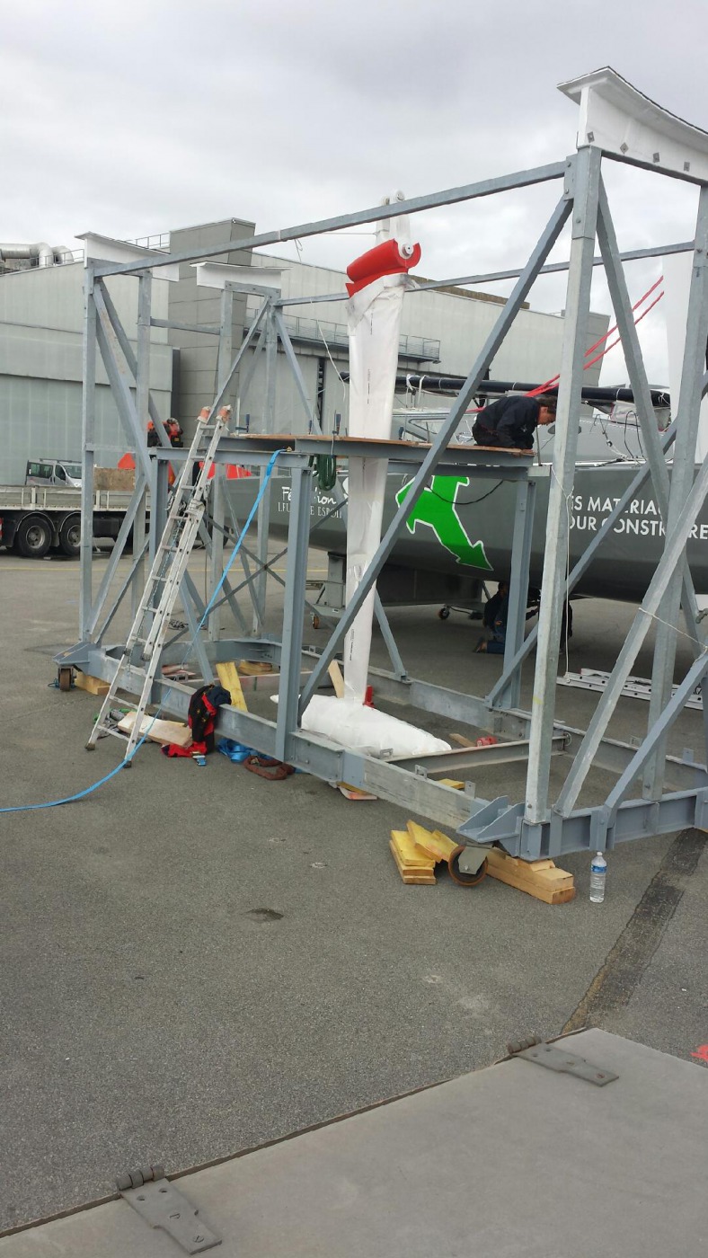 «Nous avons débuté très tôt pour laisser le temps à SᵗMichel-Virbac de faire son test à 180 degrés, et de passer à la jauge, car après il n’y a pas assez d’eau avec la marée. Quand on peut rendre service aux petits copains, c’est toujours sympa.» Premiers à entrer en piste, Yann et sa troupe auraient aimé boucler l’opération dans la journée, mais un imprévu a perturbé leurs plans : «Nous avons eu une petite surprise sur une pièce qui s’est oxydée beaucoup plus vite que prévu. Il a fallu en commander une nouvelle qui n’arrivera que demain. Nous sommes déçus car ça décale le timing d’une demie-journée, mais ça aurait pu entrainer une avarie sur la Transat Jacques Vabre, donc il vaut mieux que ça arrive maintenant. Il faut voir le bon côté des choses», relativise Yann. En stand-by, l’équipe devrait remettre le bateau à l’eau demain midi, puis des tests seront réalisés lundi. «Normalement, cette quille doit nous apporter plus de fiabilité, car elle est en inox, un matériau plus fiable que le carbone. Ce bateau a déjà perdu deux quilles, donc nous voulions assurer le coup, et nous en avons profité pour gagner aussi en matière de performance en reculant un peu le centre de gravité» confie le skipper de Quéguiner-Leucémie Espoir, qui testera ce nouvel appendice dès vendredi prochain à l’occasion du Trophée Azimut. Il participera ensuite à un dernier stage à Port-la-Forêt, avant le convoyage pour le Havre d’où s’élancera la Transat Jacques Vabre le 25 octobre prochain.