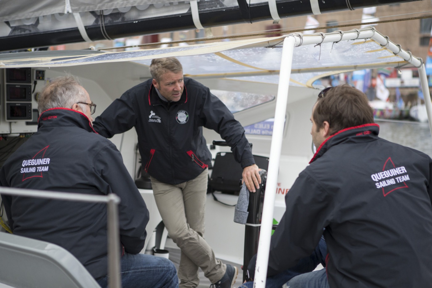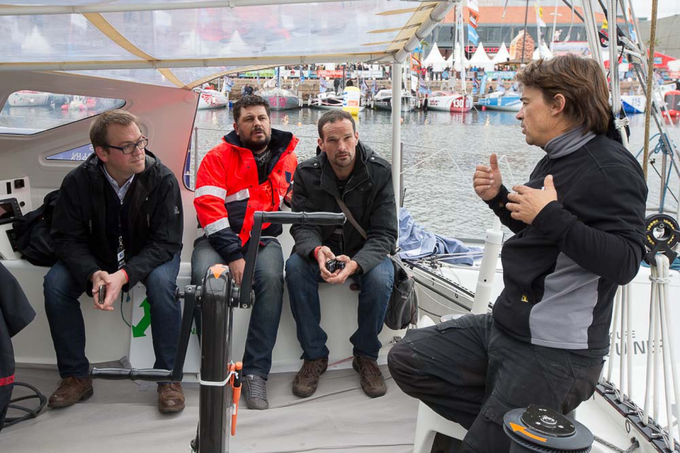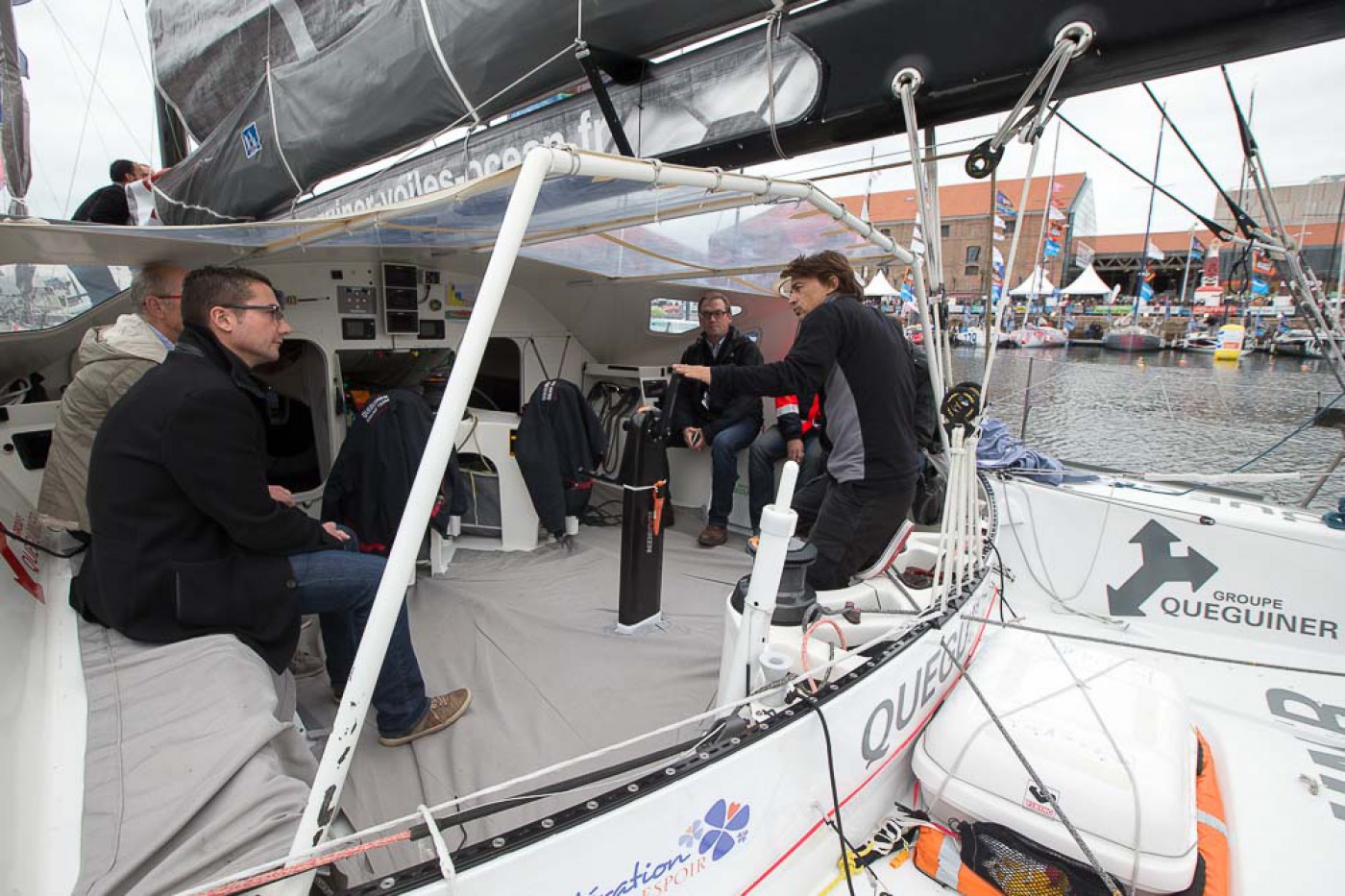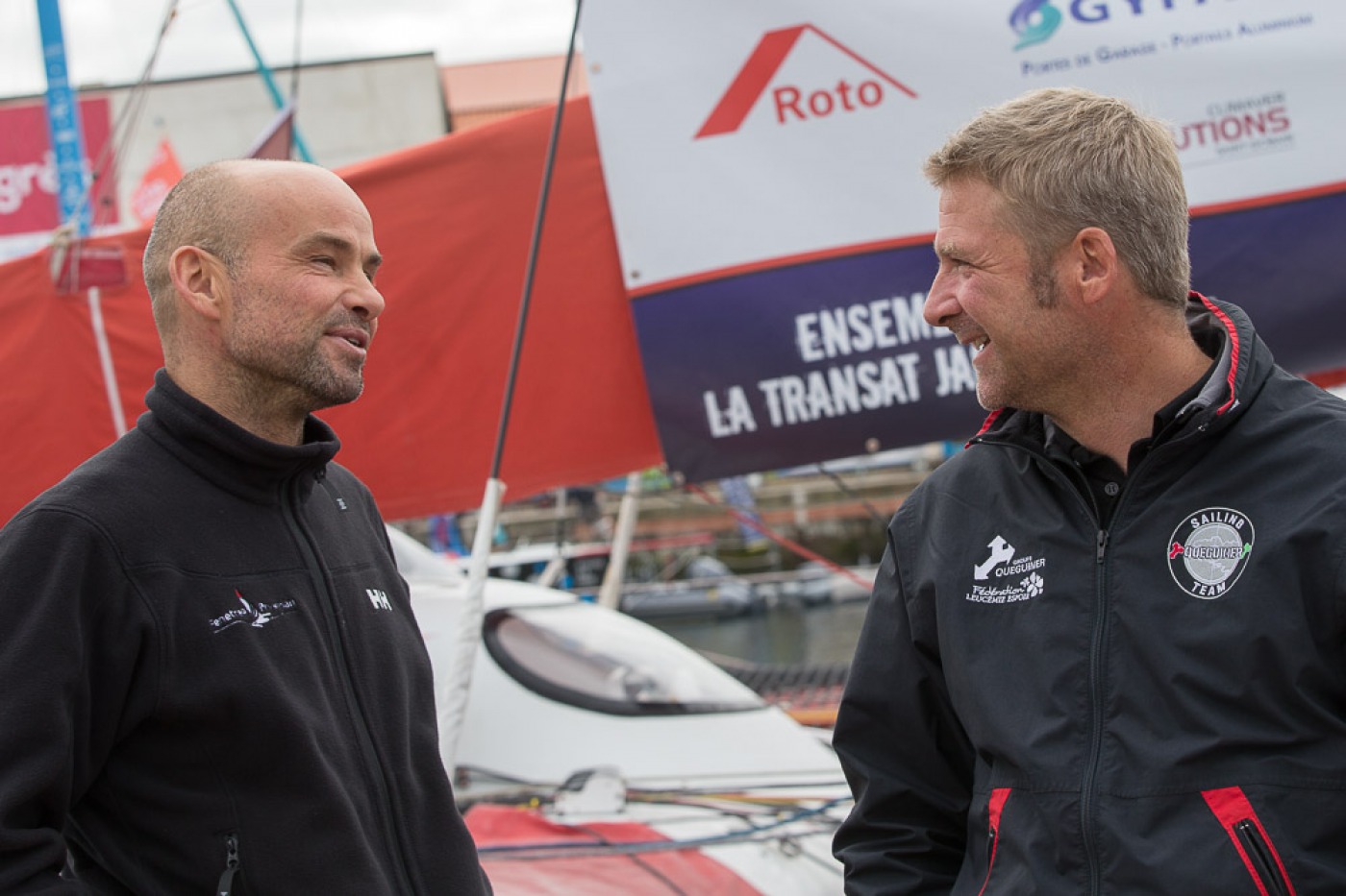 météo, kiné, rendez-vous média, plateau France bleu, rencontre avec les enfants, point technique avec l'équipe, conférence, journal de la Transat avec Serge Herbin.... Des belles journées marathon pour Yann et Charlie sur le village de la Transat Jacques Vabre.